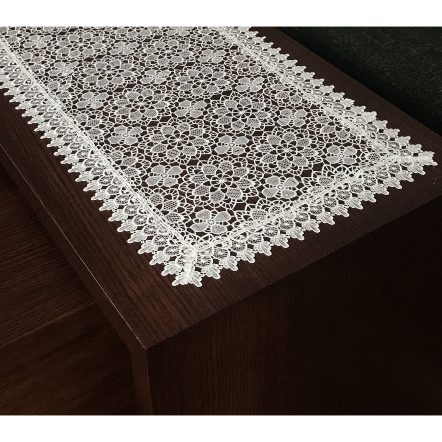 Behúň na stôl je vyrobený z dekoratívnej látky, lemovaný a ozdobený čipkou. Má vlastnosti chrániace pred škvrnami, vďaka čomu je veľmi praktický. Dekoračný behúň dodá Vášmu stolu poriadnu dávku elegancie.