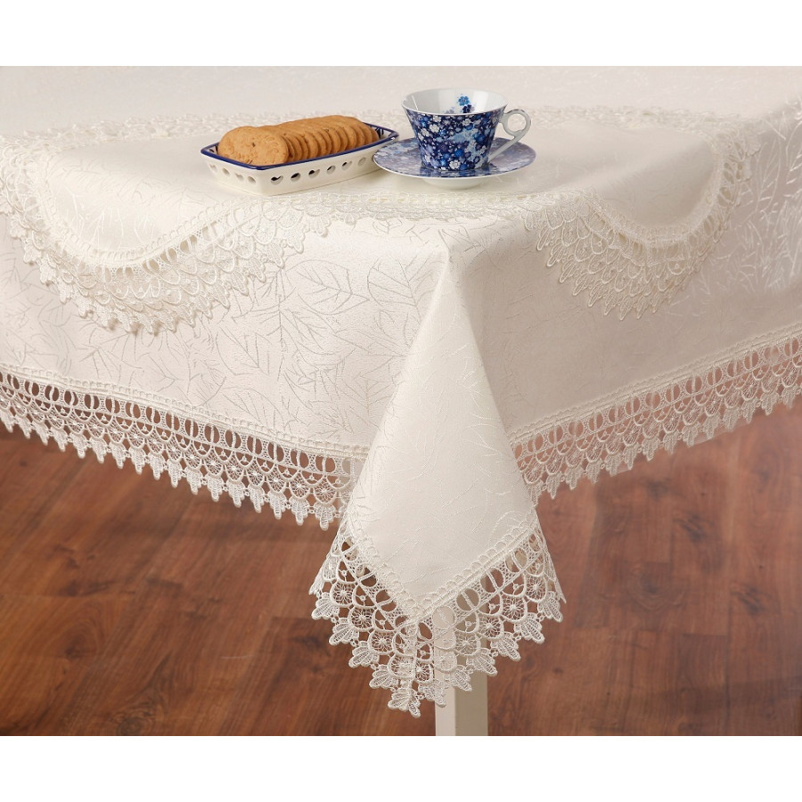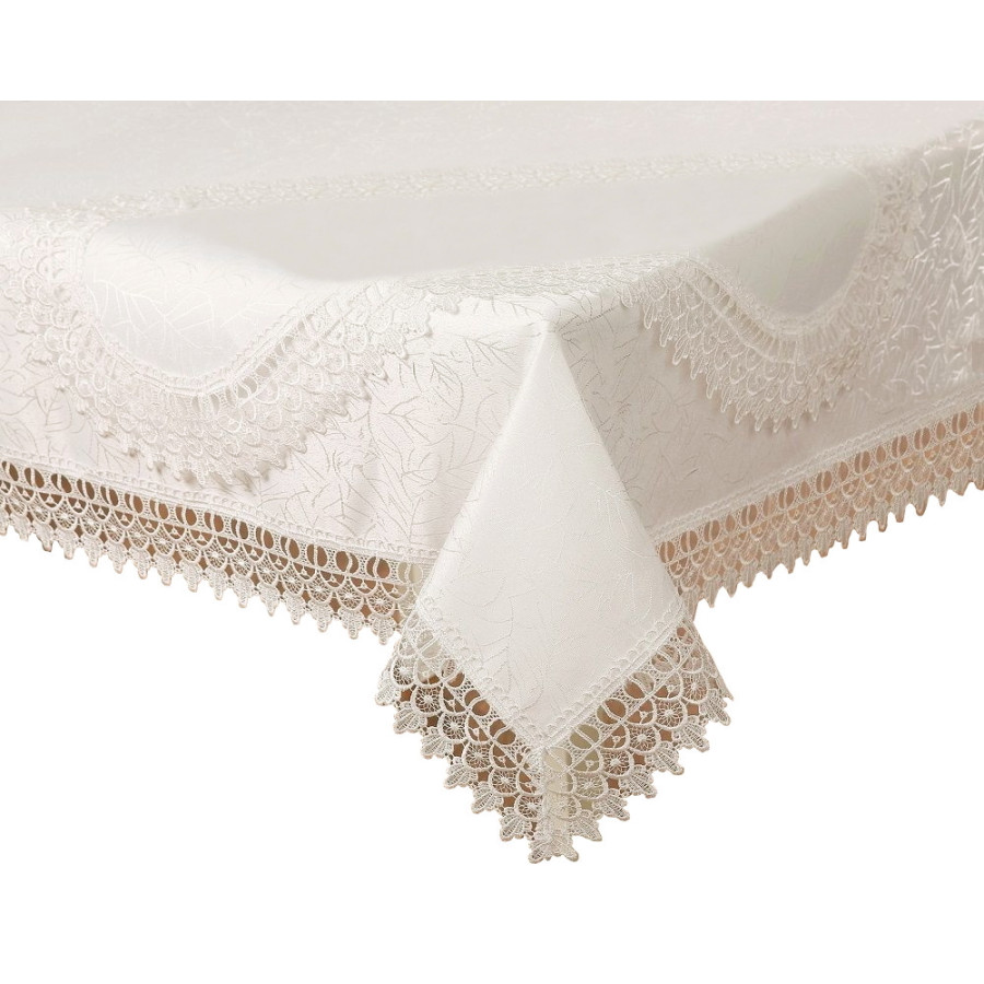 Obrus krémový s lístočkami a čipkovaným lemom