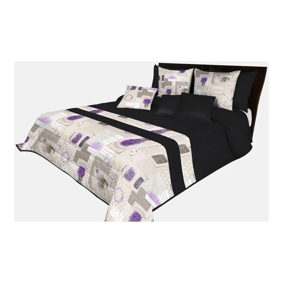Čierny elegantný dekoračný prehoz na posteľ s prešívaním a levanduľovým motívom