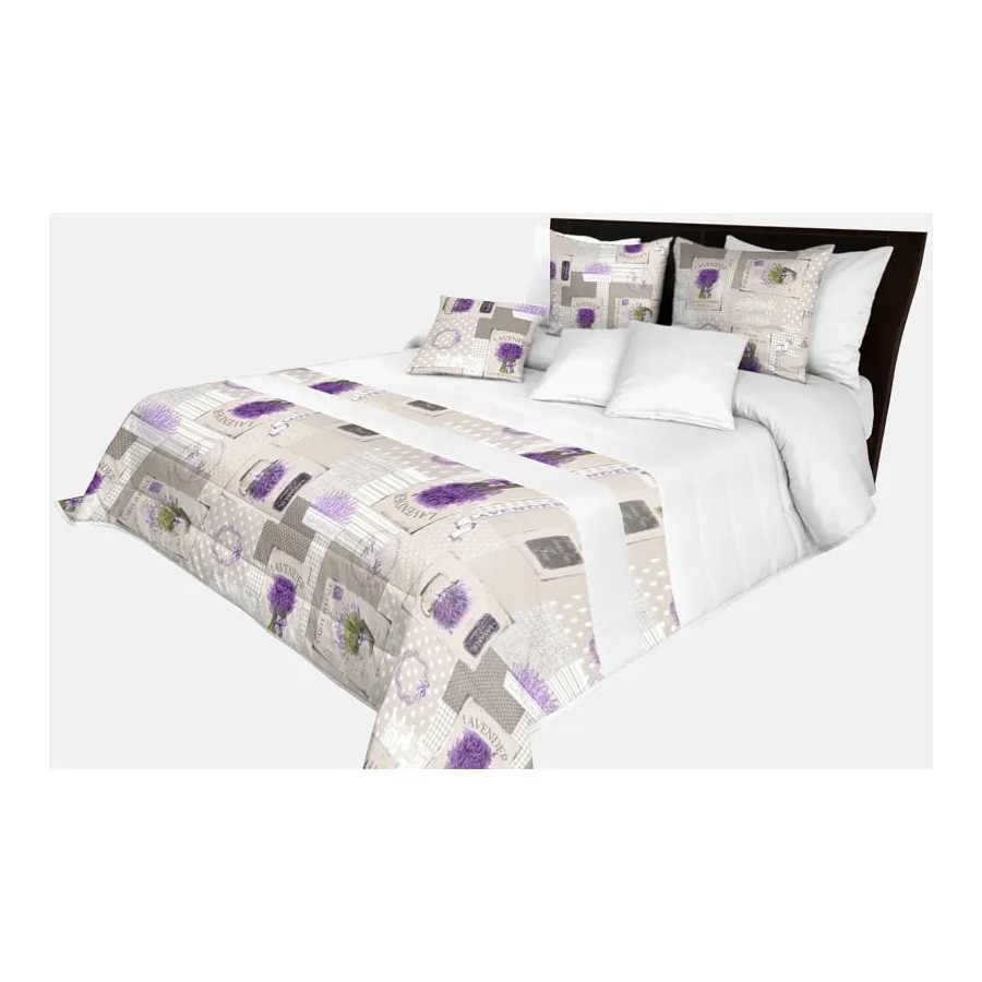 Biely prešívaný prehoz na posteľ s levanduľovou potlačou