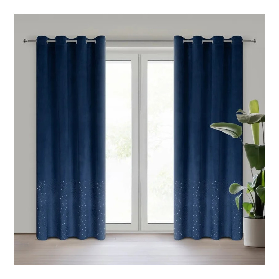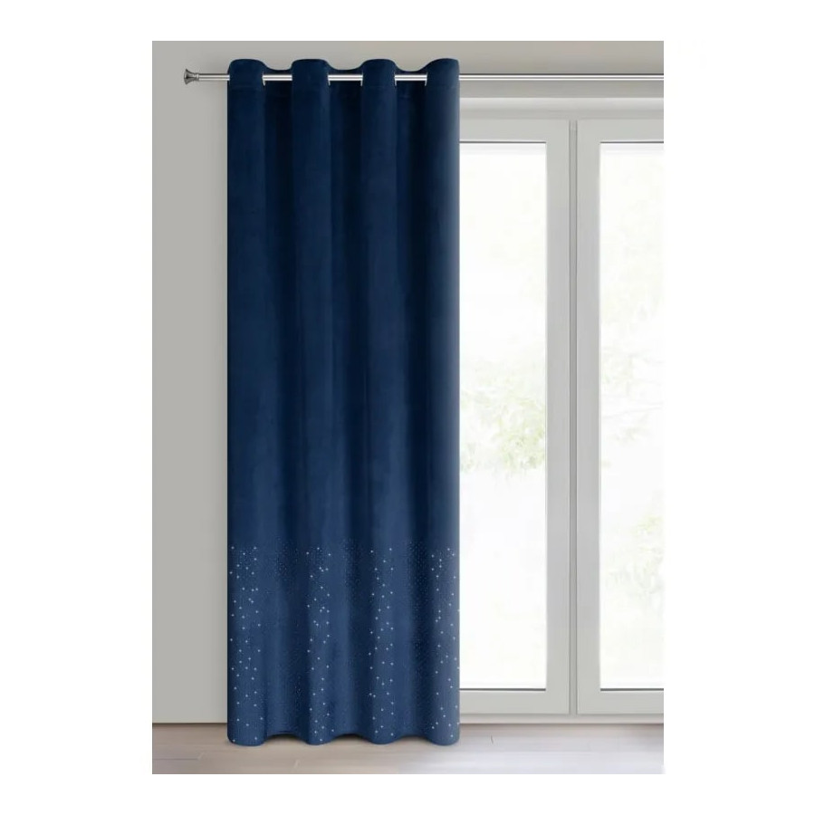 Zamatový záves zdobený diamantmi v modrej farbe