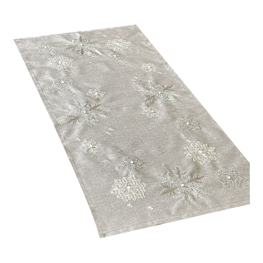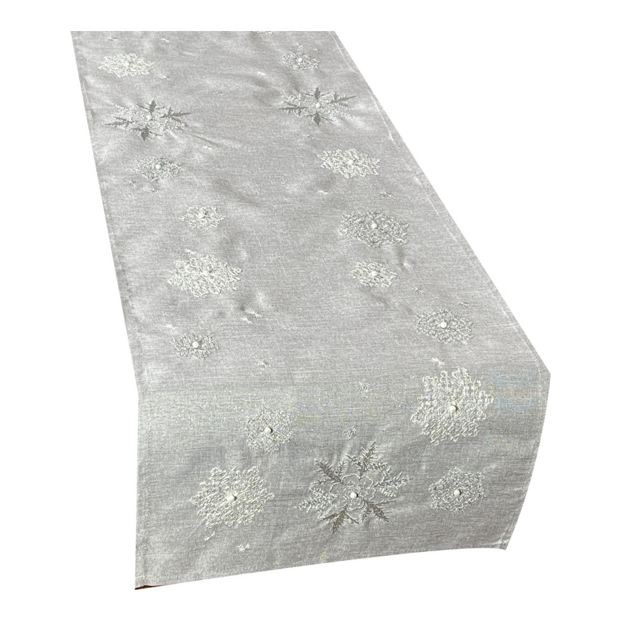 Obdĺžnikový vianočný behúň zdobený výšivkou snehových vločiek v sivej farbe