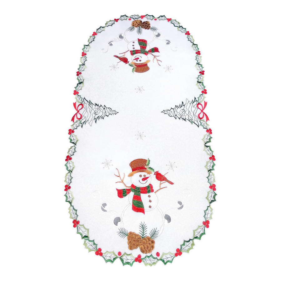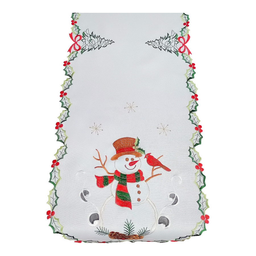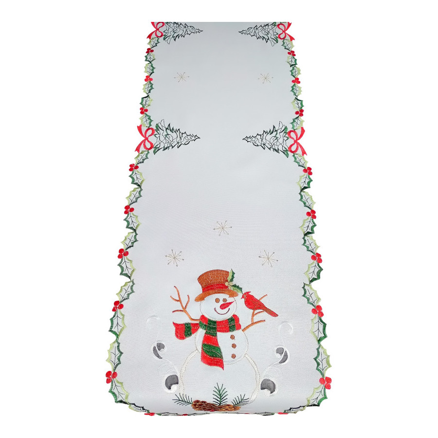 Vianočný behúň s výšivkou snehuliakov v bielej farbe