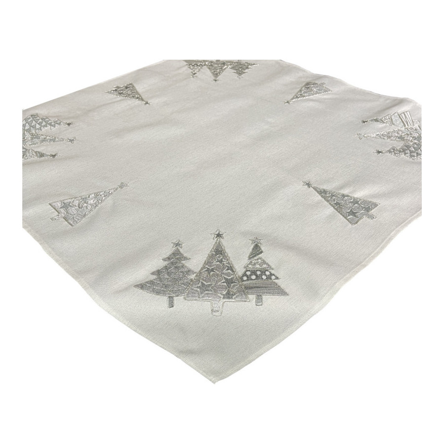 Štvorcový vianočný obrus zdobený striebornou výšivkou vianočného stromčeka