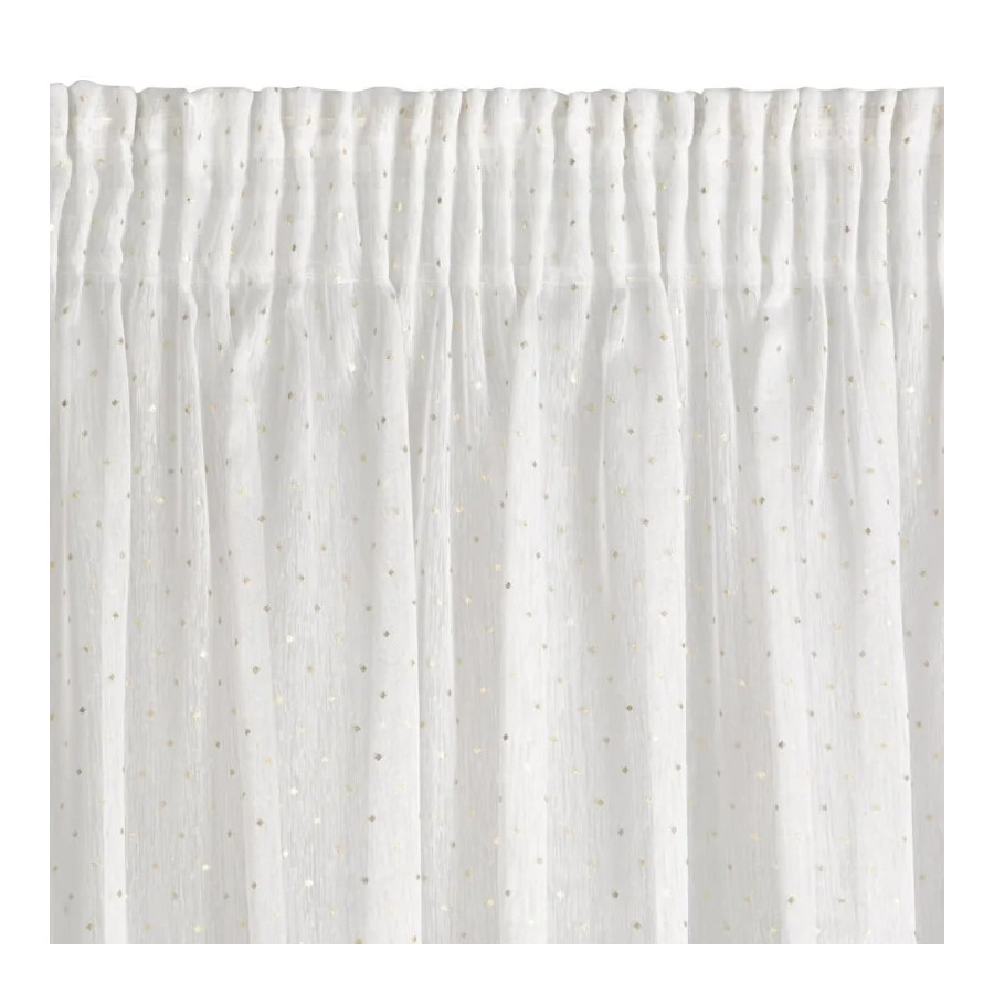 Popis:Záves vyrobený z jemnej bielej látky. Zdobený jemnou zlatou potlačou v podobe rovnomerne rozmiestnených malých štvorčekov. Riasiaca páska všitá do závesu uľahčuje aranžovanie. Nezabudnite, že počítač zobrazuje farby podľa individuálnych nastavení a vlastností. Rozmerová tolerancia: +/- 5%. Možno prať (podrobný návod na údržbu na štítku).