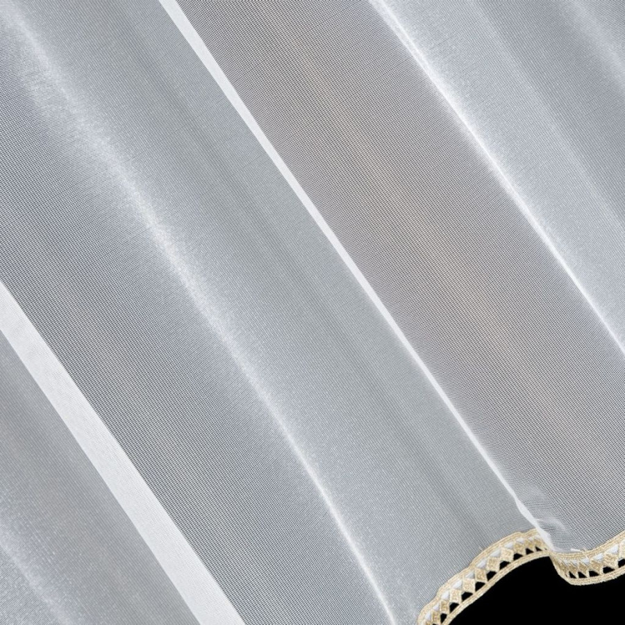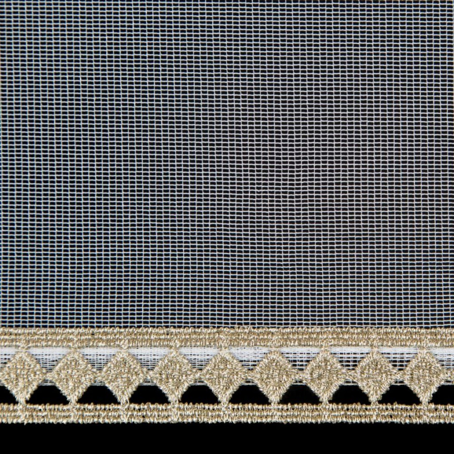 Záclona je vyrobená z jemnej, matnej sieťoviny. Spodná časť závesu je zakončená elegantnou zlatou čipkou. Vďaka jednoduchému tvaru a kvalite spracovania sa perfektne hodí do moderných interiérov a zároveň umožňuje vytvárať okenné aranžmány v klasickom štýle. Záves sa dá jednoducho pripevniť - na tento účel slúžia ozdobné krúžky zaručujúce efekt jemných, pravidelných záhybov.